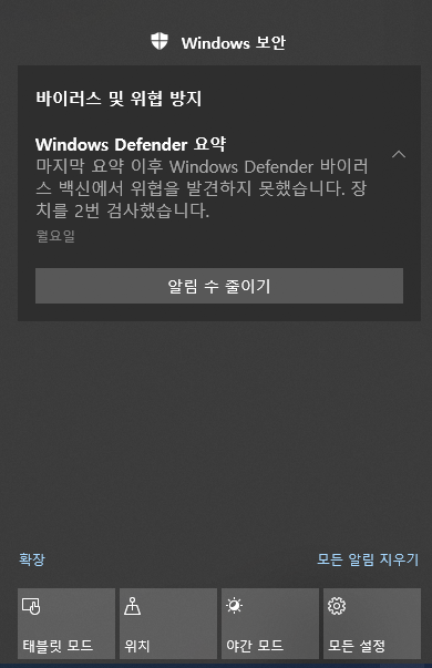 윈도 10 알림 센터에서 사용자에게 알릴 정보가 있으면 메시지를 띄웁니다.