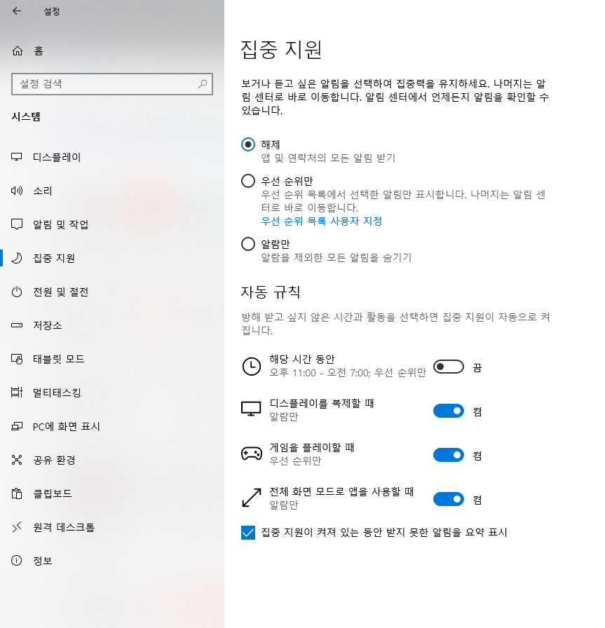 조금 더 디테일한 설정을 원하시면 알림 및 작업 밑에 있는 집중 지원에서 이용 가능합니다.