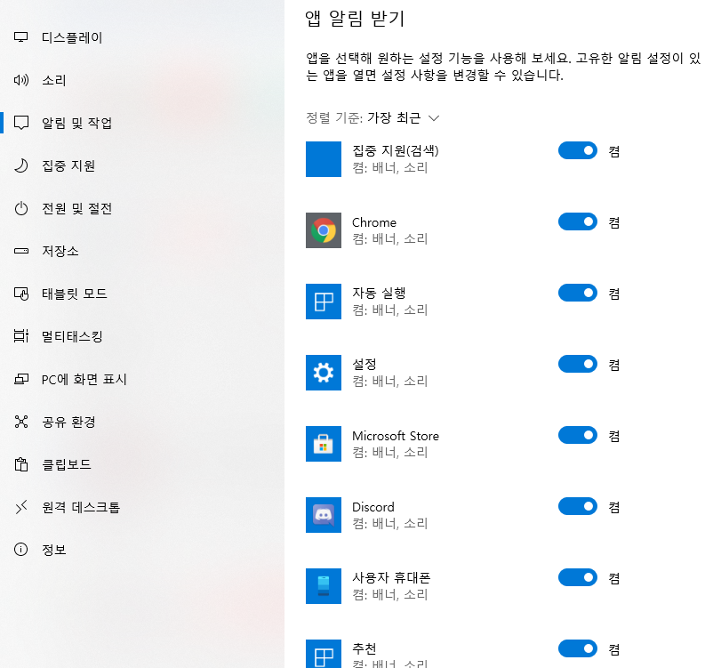 알림 및 작업에서 앱 알림 받기에 알림을 받기 싫은 앱은 차단 설정이 가능합니다.