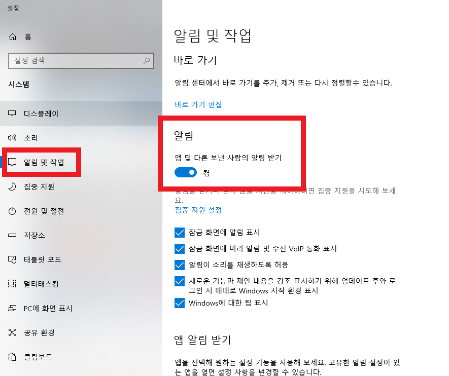 (윈도 설정의 시스템 - 알림 및 작업을 클릭하셔도 동일합니다.)