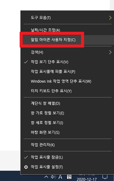 1. 날짜, 시간 영역에서 마우슨 오른쪽을 클릭합니다. 나타나는 메뉴들에서 '알림 아이콘 사용자 지정'을 클릭합니다.