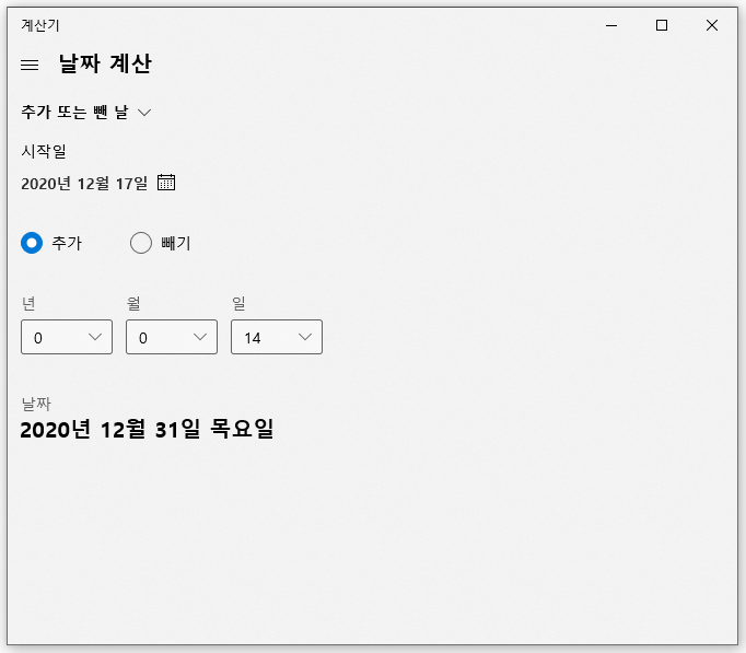년, 월, 일 순으로 얼마나 지정한 날짜에서 추가하거나 빼기를 할 것인지 선택하시면 원하시는 결과 날짜가 나타납니다.