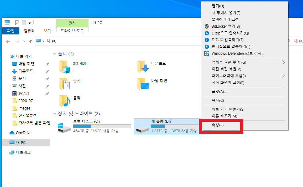 먼저 파일 탐색기에서 조각 모음을 하고 싶은 드라이브를 선택합니다. 그리고 마우스 우클릭을 하여 나오는 메뉴들 중에서 속성을 선택합니다.