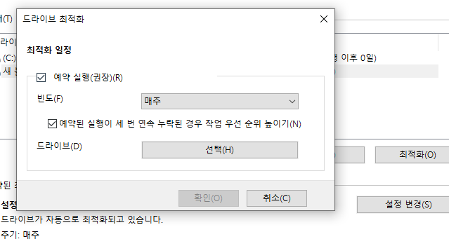 설정 변경 버튼을 클릭하면 '드라이브 최적화' 창이 나타나며 예약 실행 박스가 보이는데 빈도에서 매일, 매주, 매월 중에 선택 가능하고 드라이브도 자동으로 조각모음 할 드라이브를 선택 가능합니다.