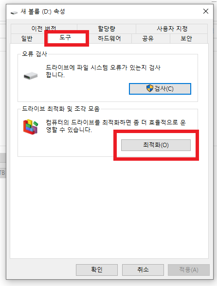 속성을 선택하시면 나오는 탭에서 상단에 도구를 클릭합니다. 그리고 화면에 나와있는 '드라이브 최적화 및 조각 모음'에 있는 최적화 버튼을 클릭합니다.