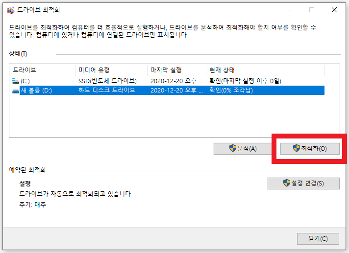 최적화 버튼을 클릭하시면 '드라이브 최적화' 창이 나타나는데, 상태에 있는 목록 중에 드라이브를 선택하고 아래에 있는 최적화 버튼을 클릭합니다.