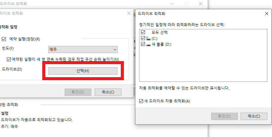 드라이브 선택을 클릭하면 정기적인 일정에 따라 최적화하려는 드라이브를 선택 가능합니다.