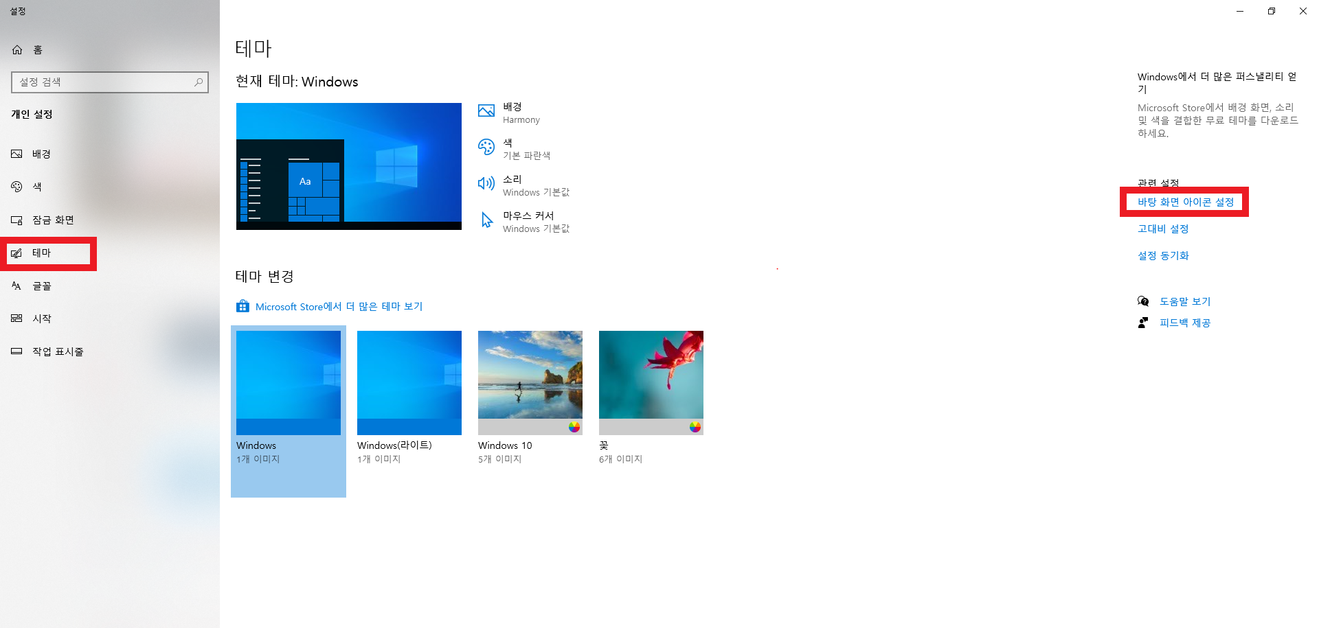 설정에 들어오셔서 좌측 탭에 있는 '테마'를 선택한 후 우측의 관련설 정의 '바탕 화면 아이콘 설정'을 클릭합니다.