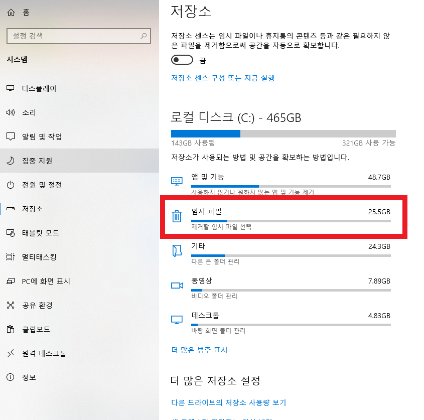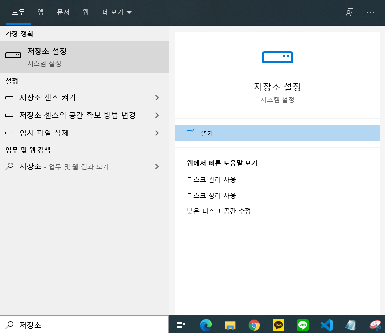 디스크 정리와 저장소 설정 중에서 한 가지만 하셔도 무방합니다.