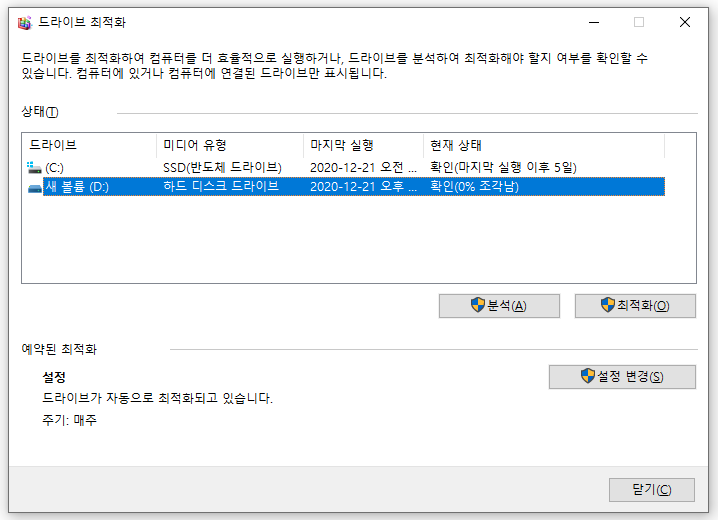 드라이브 최적화에 들어오시면 조각모음을 실행할 드라이브를 선택한 후 분석 및 최적화를 진행하시면 됩니다.