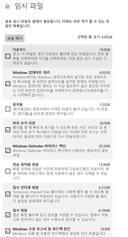 임시 파일을 클릭하시면 아까와 비슷하게 임시파일의 목록과 각 목록의 용량이 나타납니다.