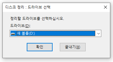 디스크 정리를 원하는 드라이브를 선택하고 확인 버튼을 클릭합니다.
