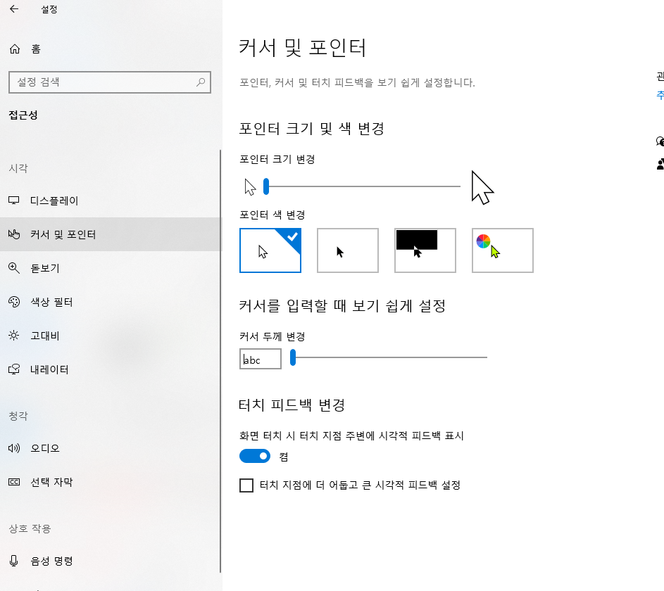 커서 및 포인터에 들어오시면 마우스 커서의 포인터 크기 변경부터 포인터의 색 변경까지 가능합니다.