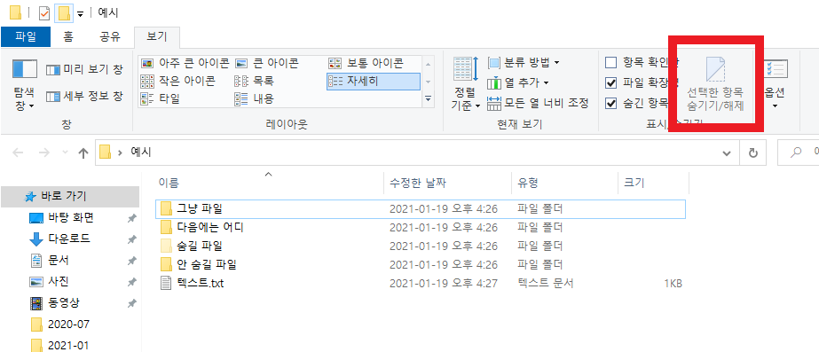 앞서 나왔던 선택한 항목 숨기기/해제 방법도 있지만 다른 방법의 파일 숨기는 방법을 소개해 드리겠습니다.
