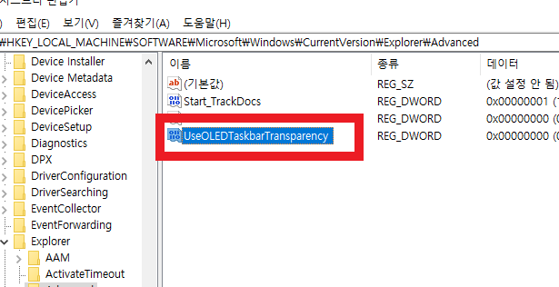 5. UseOLEDTaskbarTransparency 를 더블클릭을 하여 값 편집 창을 열고, 값 데이터의 값을 1로 변경을 합니다.