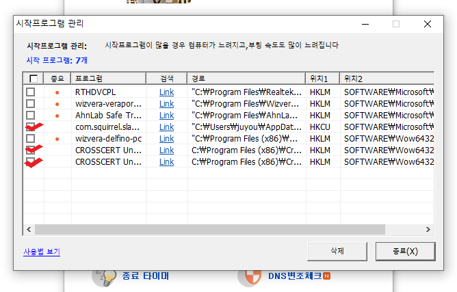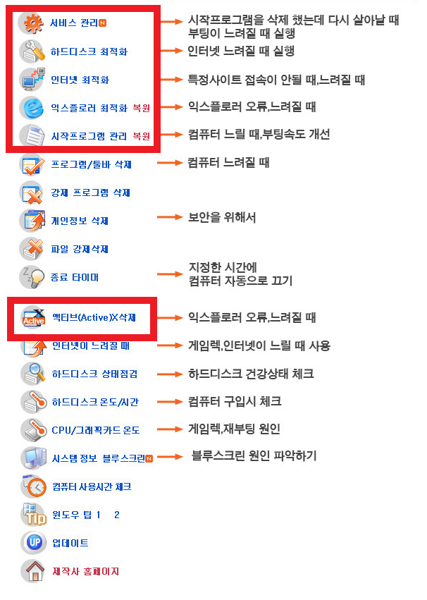 - 시작프로그램 관리는 필요하지 않은 시작프로그램을 관리하여 불필요한 리소스 낭비를 막아줍니다. 시작 프로그램이 많을 경우 컴퓨터가 느려지고 부팅속도 저하의 원인이 됩니다. 여기서 중요한 것은 중요 부분의 오렌지색으로 표시되어 있는 것들을 제외하고 삭제하시기 바랍니다. 오렌지 삭제 시 컴퓨터 오류를 발생시킬 수 있다고 합니다.