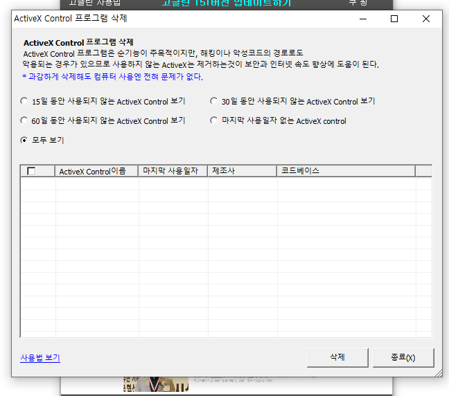 1. 메뉴에 있는 액티브 X 삭제를 클릭합니다.