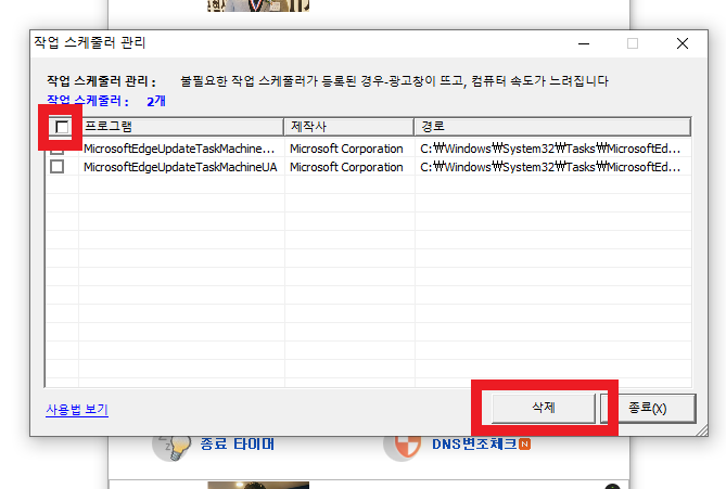- 작업 스케줄러 관리 기능은 시작프로그램과 기능은 비슷한 기능을 합니다. 예약한 시간에 프로그램이 작동하도록 만들어진 것이 서비스 관리 기능과 조금 다른 점이 있는데, 악성코드가 악용하는 경우가 많아 대부분 삭제해도 무방합니다.