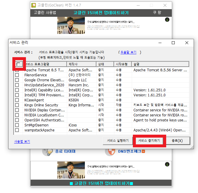 3. 하단의 서비스 중지하기를 클릭합니다.