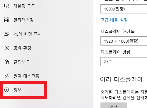 3. 시스템을 클릭해서 들어오시면 왼쪽 메뉴 중에서 제일 하단의 정보를 클릭합니다.