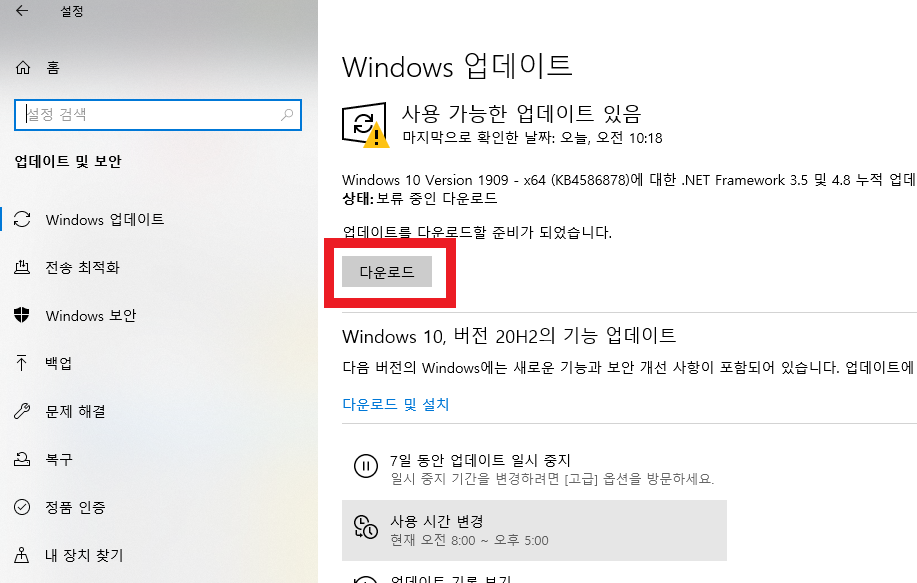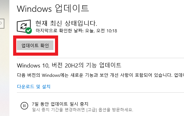 3. 업데이트 및 보안을 클릭하시면 Windows 업데이트 메뉴에서 빨간색 네모 부분에서 업데이트 가능한 윈도우 버전이 있는지 확인이 가능합니다. 만약 최신 상태의 버전이 설치 되어 있다면 다운로드가 아닌 업데이트 확인이라는 버튼이 있습니다.