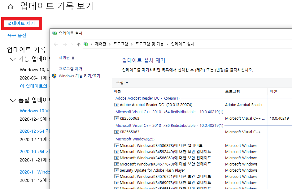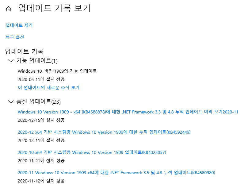 업데이트 기록 상세 페이지에서 언제 무엇이 설치 되었는지 확인할 수 있습니다. 그리고 만약 사용하던 기능이 없어졌다면 업데이트 제거를 통해서 원상복구도 가능합니다.