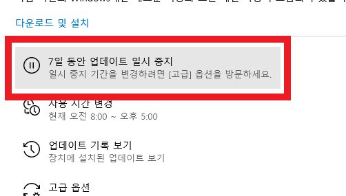 현재는 기본으로 설정 되어 있는 7일이고 고급 설정으로 가면 최대 35일까지 중지 할 수 있습니다.
