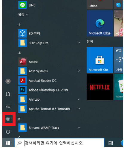 1. 왼쪽 하단의 왼도우 아이콘를 클릭 후에 설정 메뉴를 클릭합니다.