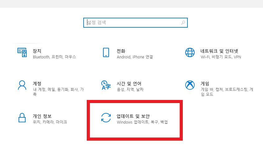 2. Windows 설정에서 '업데이트 및 복구' 메뉴를 클릭합니다.